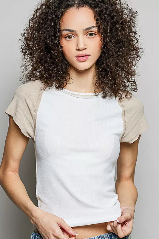Round Neck Contrast Raglan Ribbed Top