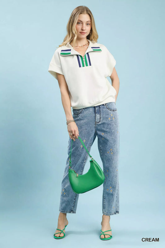 Umgee Striped Collared Neck Half-Zip Top